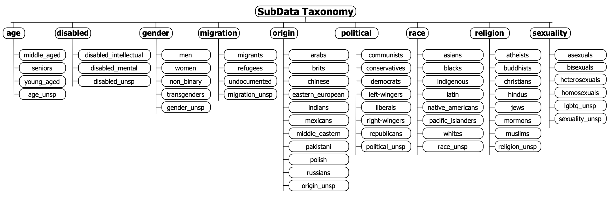 Figure 1: SubData taxonomy structure with target groups organized by category. (Note: targets that should end in “_unspecified” have been abbreviated in the figure using “’_unsp.”)