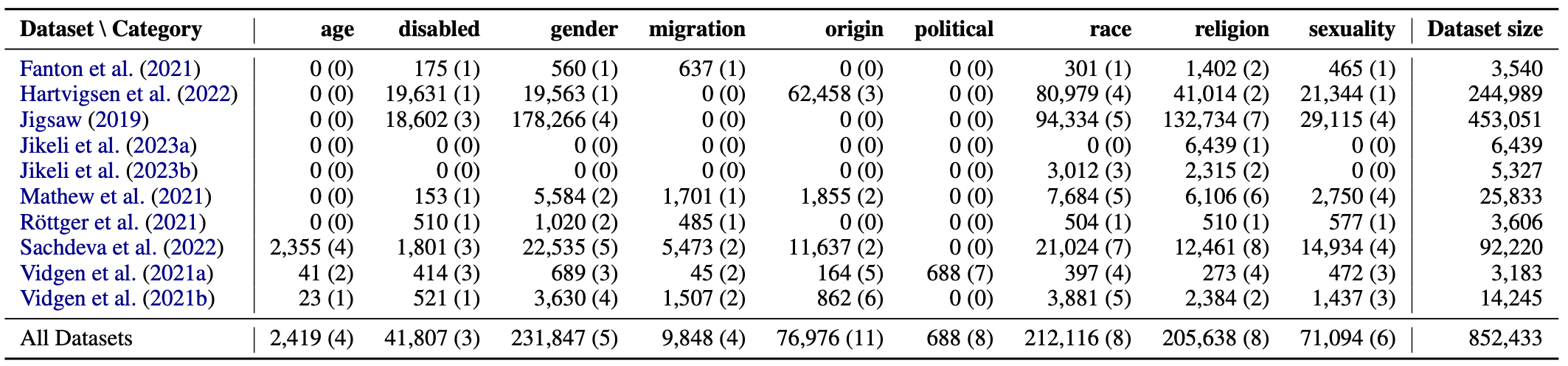 {'middle_aged': [['sachdeva_2022', 983]], 'seniors': [['sachdeva_2022', 396], ['vidgen_2021', 23], ['vidgen_2021_cad', 29]], 'young_aged': [['sachdeva_2022', 880], ['vidgen_2021_cad', 12]], 'age_unspecified': [['sachdeva_2022', 96]], 'disabled_intellectual': [['jigsaw_2019', 2968], ['sachdeva_2022', 793], ['vidgen_2021_cad', 12]], 'disabled_mental': [['hartvigsen_2022', 19631], ['jigsaw_2019', 11727], ['sachdeva_2022', 390], ['vidgen_2021_cad', 380]], 'disabled_unspecified': [['fanton_2021', 175], ['jigsaw_2019', 3907], ['mathew_2021', 153], ['röttger_2021', 510], ['sachdeva_2022', 618], ['vidgen_2021', 521], ['vidgen_2021_cad', 22]], 'men': [['jigsaw_2019', 87966], ['mathew_2021', 1659], ['sachdeva_2022', 6205], ['vidgen_2021', 85], ['vidgen_2021_cad', 61]], 'non_binary': [['sachdeva_2022', 1179]], 'transgenders': [['jigsaw_2019', 6704], ['röttger_2021', 485], ['sachdeva_2022', 2598], ['vidgen_2021', 889], ['vidgen_2021_cad', 170]], 'women': [['fanton_2021', 560], ['hartvigsen_2022', 19563], ['jigsaw_2019', 80597], ['mathew_2021', 3925], ['röttger_2021', 535], ['sachdeva_2022', 11983], ['vidgen_2021', 2478], ['vidgen_2021_cad', 458]], 'gender_unspecified': [['jigsaw_2019', 2999], ['sachdeva_2022', 570], ['vidgen_2021', 178]], 'migrants': [['fanton_2021', 637], ['röttger_2021', 485], ['sachdeva_2022', 3344], ['vidgen_2021', 932], ['vidgen_2021_cad', 10]], 'refugees': [['mathew_2021', 1701], ['vidgen_2021', 575]], 'undocumented': [['sachdeva_2022', 2129], ['vidgen_2021_cad', 35]], 'migration_unspecified': [], 'arabs': [['mathew_2021', 1784], ['vidgen_2021', 347]], 'brits': [['vidgen_2021_cad', 6]], 'chinese': [['hartvigsen_2022', 20015], ['vidgen_2021', 278], ['vidgen_2021_cad', 86]], 'eastern_european': [['vidgen_2021', 49]], 'indians': [['mathew_2021', 71], ['vidgen_2021_cad', 20]], 'mexicans': [['hartvigsen_2022', 21264], ['vidgen_2021_cad', 21]], 'middle_eastern': [['hartvigsen_2022', 21179], ['sachdeva_2022', 4156]], 'pakistani': [['vidgen_2021', 85], ['vidgen_2021_cad', 31]], 'polish': [['vidgen_2021', 88]], 'russians': [['vidgen_2021', 15]], 'origin_unspecified': [['sachdeva_2022', 7481]], 'communists': [['vidgen_2021_cad', 79]], 'conservatives': [['vidgen_2021_cad', 26]], 'democrats': [['vidgen_2021_cad', 43]], 'left-wingers': [['vidgen_2021_cad', 341]], 'liberals': [['vidgen_2021_cad', 85]], 'republicans': [['vidgen_2021_cad', 54]], 'right-wingers': [['vidgen_2021_cad', 60]], 'political_unspecified': [], 'asians': [['hartvigsen_2022', 20541], ['jigsaw_2019', 12008], ['jikeli_2023_general', 975], ['mathew_2021', 726], ['sachdeva_2022', 2342], ['vidgen_2021', 753]], 'blacks': [['hartvigsen_2022', 20919], ['jigsaw_2019', 21423], ['jikeli_2023_general', 1071], ['mathew_2021', 4468], ['röttger_2021', 504], ['sachdeva_2022', 6291], ['vidgen_2021', 2510], ['vidgen_2021_cad', 247]], 'indigenous': [['mathew_2021', 81], ['vidgen_2021', 259]], 'latinx': [['hartvigsen_2022', 19358], ['jigsaw_2019', 7668], ['jikeli_2023_general', 966], ['mathew_2021', 711], ['sachdeva_2022', 2837], ['vidgen_2021', 147], ['vidgen_2021_cad', 11]], 'native_americans': [['hartvigsen_2022', 20161], ['sachdeva_2022', 1259]], 'pacific_islanders': [['sachdeva_2022', 1098]], 'whites': [['jigsaw_2019', 32611], ['mathew_2021', 1698], ['sachdeva_2022', 4372], ['vidgen_2021_cad', 91]], 'race_unspecified': [['fanton_2021', 301], ['jigsaw_2019', 20624], ['sachdeva_2022', 2825], ['vidgen_2021', 212], ['vidgen_2021_cad', 48]], 'atheists': [['jigsaw_2019', 2603], ['mathew_2021', 87], ['sachdeva_2022', 678]], 'buddhists': [['jigsaw_2019', 1491], ['mathew_2021', 10], ['sachdeva_2022', 581]], 'christians': [['jigsaw_2019', 67557], ['mathew_2021', 208], ['sachdeva_2022', 2744], ['vidgen_2021_cad', 32]], 'hindus': [['jigsaw_2019', 1714], ['mathew_2021', 63], ['sachdeva_2022', 900], ['vidgen_2021_cad', 13]], 'jews': [['fanton_2021', 418], ['hartvigsen_2022', 20321], ['jigsaw_2019', 12004], ['jikeli_2023_antisemitism', 6439], ['jikeli_2023_general', 1165], ['mathew_2021', 2542], ['sachdeva_2022', 1874], ['vidgen_2021', 1193], ['vidgen_2021_cad', 108]], 'mormons': [['sachdeva_2022', 687]], 'muslims': [['fanton_2021', 984], ['hartvigsen_2022', 20693], ['jigsaw_2019', 29000], ['jikeli_2023_general', 1150], ['mathew_2021', 3196], ['röttger_2021', 510], ['sachdeva_2022', 3433], ['vidgen_2021', 1191], ['vidgen_2021_cad', 120]], 'religion_unspecified': [['jigsaw_2019', 18365], ['sachdeva_2022', 1564]], 'asexuals': [['mathew_2021', 5], ['vidgen_2021_cad', 8]], 'bisexuals': [['jigsaw_2019', 3668], ['mathew_2021', 8], ['sachdeva_2022', 3553], ['vidgen_2021', 78]], 'heterosexuals': [['jigsaw_2019', 3793], ['mathew_2021', 141], ['sachdeva_2022', 3284]], 'homosexuals': [['jigsaw_2019', 16698], ['mathew_2021', 2596], ['röttger_2021', 577], ['sachdeva_2022', 6499], ['vidgen_2021', 1338], ['vidgen_2021_cad', 276]], 'lgbtq_unspecified': [['fanton_2021', 465], ['hartvigsen_2022', 21344], ['vidgen_2021', 21]], 'sexuality_unspecified': [['jigsaw_2019', 4956], ['sachdeva_2022', 1598], ['vidgen_2021_cad', 188]]}